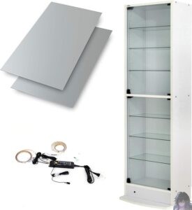 Spec: 鍵付き。LED・背面ミラー増設可。突っ張り上置きで耐震強化。